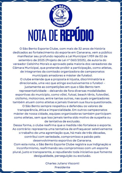 Em um movimento de protesto, o time de futebol amador São Bento de Canarana publicou uma nota de repúdio contra a nova lei municipal que proíbe a participação de servidores em eventos esportivos realizados pela Secretaria de Esportes.