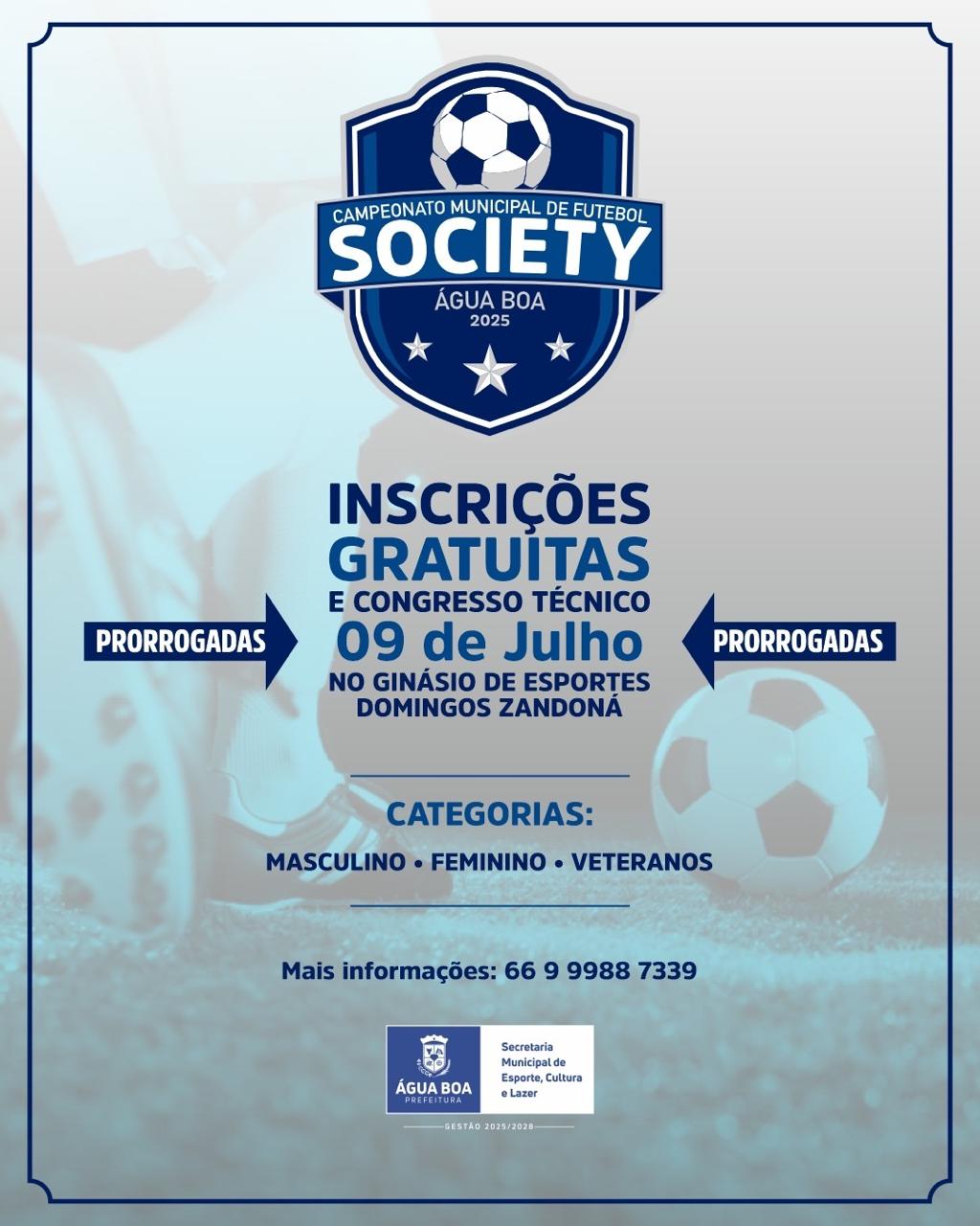 ÁGUA BOA – A Secretaria de Esportes, Cultura e Lazer de Água Boa realizará hoje, quarta-feira, 9 de julho, às 19h, o congresso técnico para o Campeonato Municipal de Futebol Society.