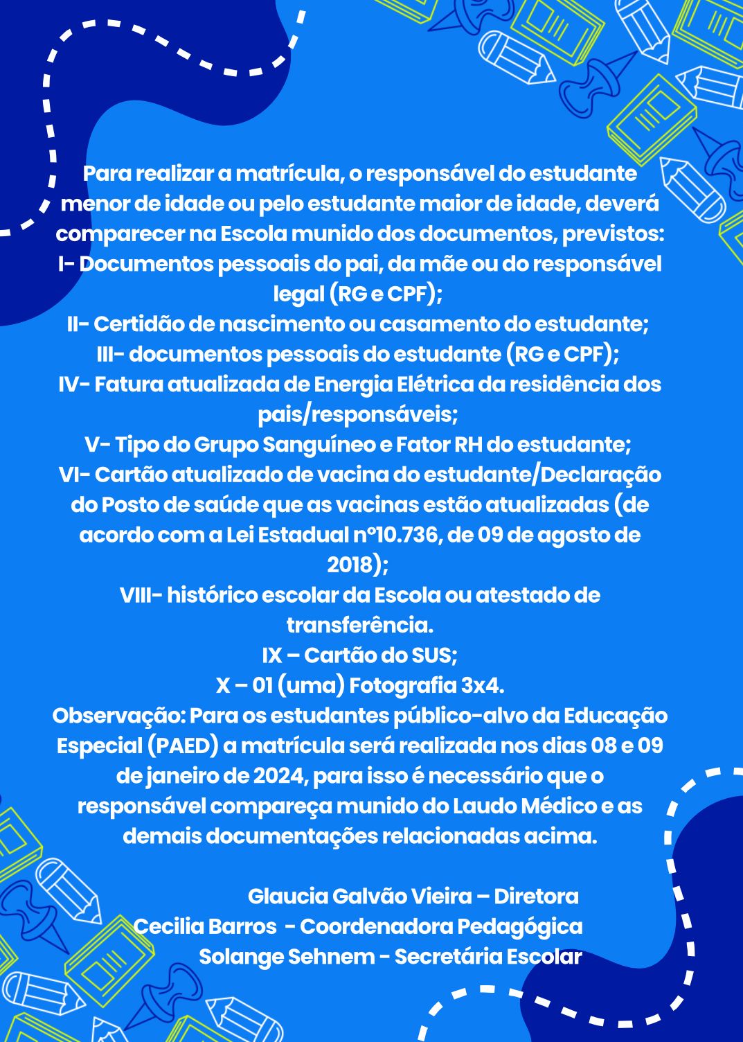 QUERÊNCIA - A nova equipe da Diretoria da Escola Estadual Querência, em exercício desde o dia 2 de janeiro para a gestão de 2024, informa que as matrículas estão oficialmente abertas a partir de 9 de janeiro. De acordo com a nova Secretária Roberta os interessados podem realizar as matrículas presenciais no prédio da escola, na secretaria, com atendimento das 7h às 18h. Este processo está de acordo com a Portaria Nº 1214/2023/GS/SEDUC/MT, que dispõe sobre os critérios para matrículas e rematrículas dos estudantes na Rede Pública Estadual de Ensino para o ano letivo de 2024.