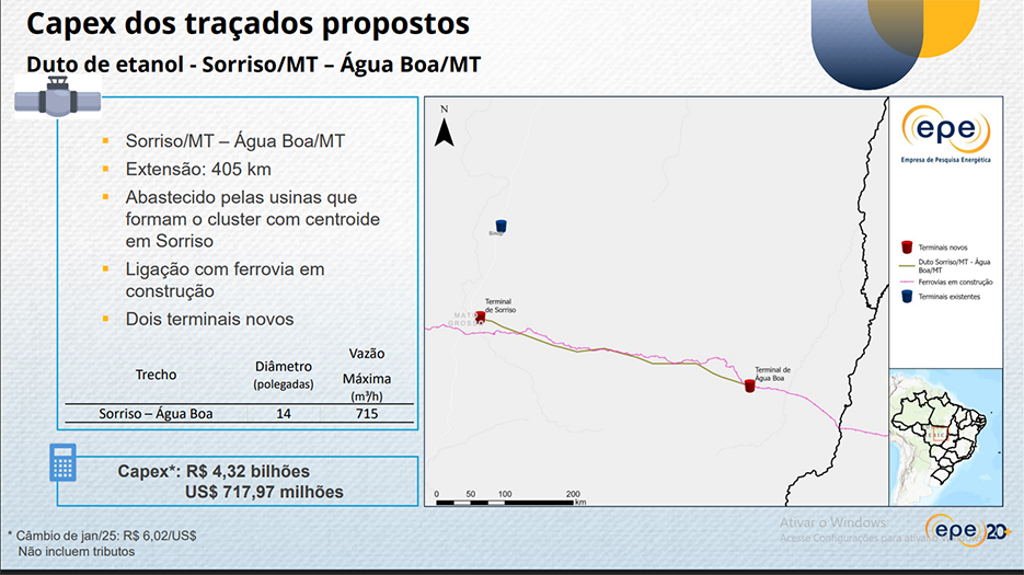 Um dos projetos citados pela EPE seria um óleo ligando sorriso com Água Boa. A estrutura teria 405 quilômetros de extensão e serviria para escoamento de etanol de Sorriso para Água Boa. Certamente a vinda da Ferrovia de Integração Centro Oeste para Água Boa colabora para que esse projeto seja antecipado em breve.