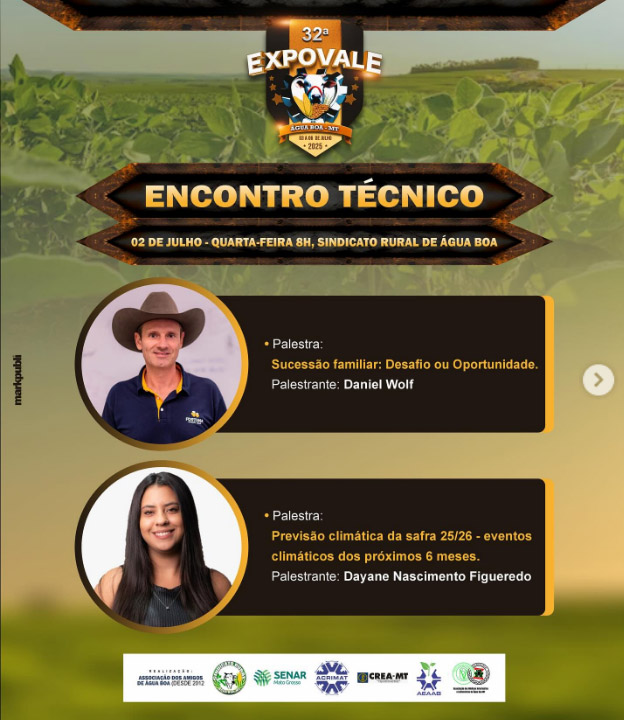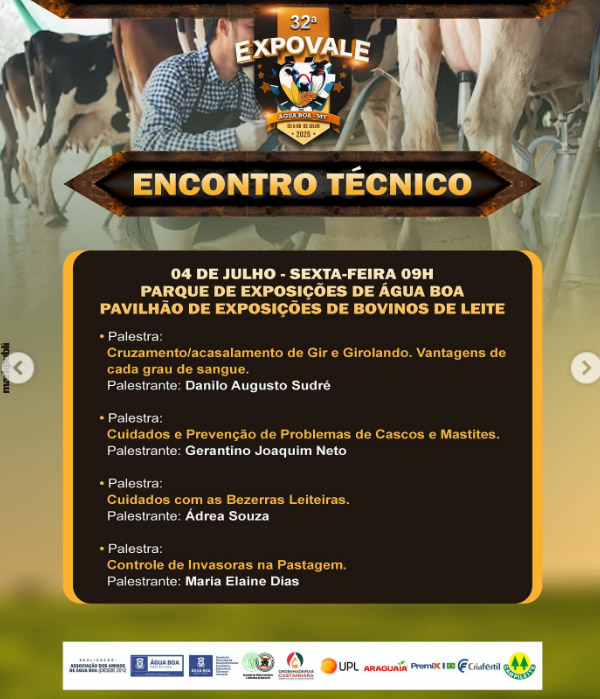 Atualizada 30 junho 2025ÁGUA BOA – Começa nesta quarta-feira, 02 de julho, o Encontro Técnico durante a 32ª Expovale. Serão três dias de muito conhecimento, troca de experiências e novidades do agronegócio.