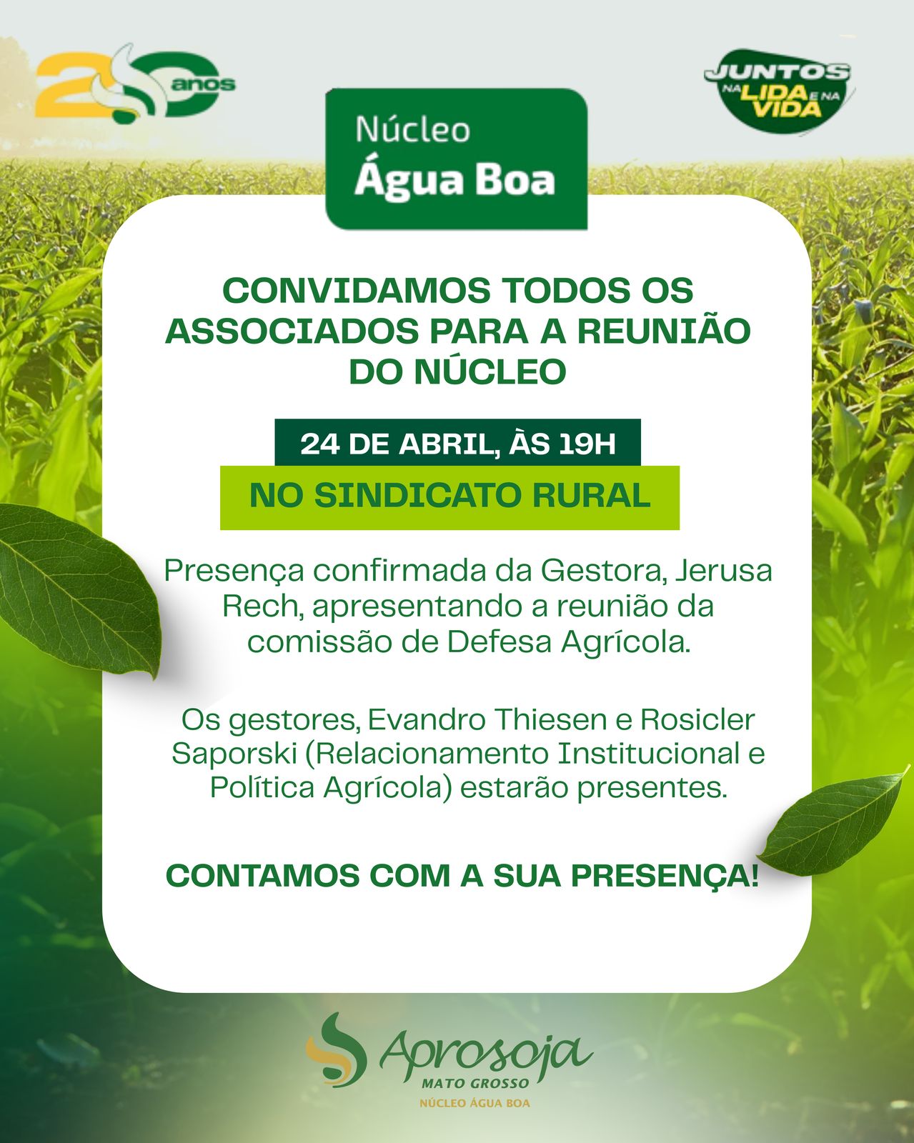 ÁGUA BOA - O Núcleo Aprosoja local terá reunião nesta quinta-feira, 24 de abril, a partir das 19h.