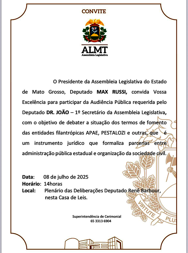 A iniciativa é do deputado Dr. João. Em pauta, a situação dos termos de fomento do governo às entidades filantrópicas como APAE, Pestalozzi e outras.
