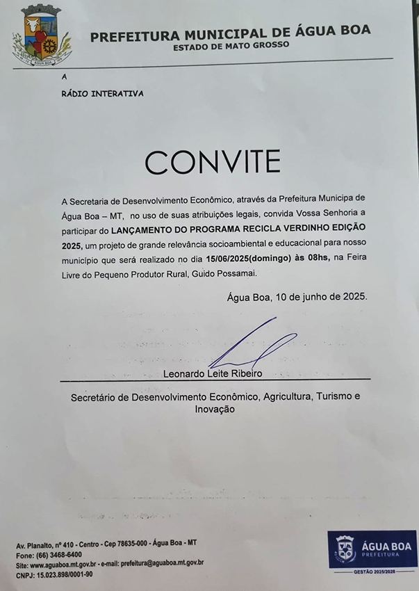 ÁGUA BOA - A Secretaria de Desenvolvimento Econômico, Agricultura, Turismo e Inovação, lança o programa Recicla Verdinho Edição 2025.