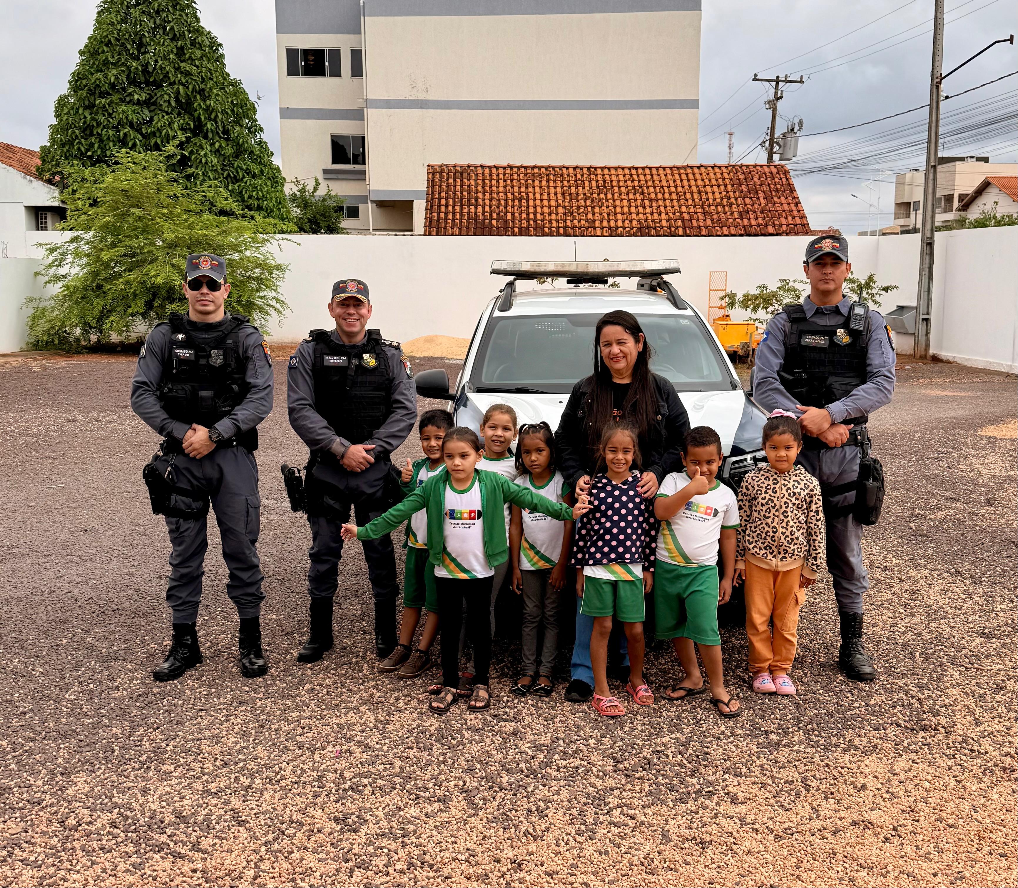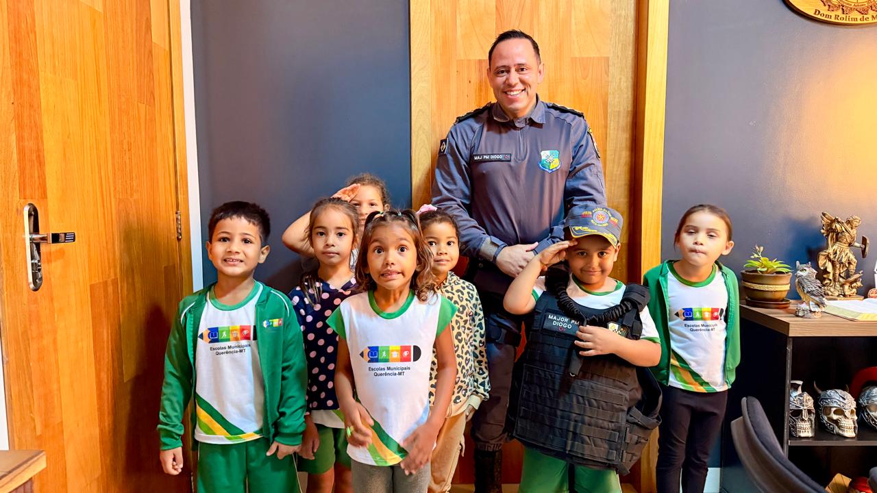 QUERÊNCIA - Na manhã desta data, crianças da Escola Municipal de Educação Básica Pingos d’Água realizaram uma visita ao quartel da Polícia Militar de Querência-MT. A atividade teve como objetivo aproximar os alunos da instituição policial, permitindo que conhecessem de perto o trabalho desenvolvido pelos militares.