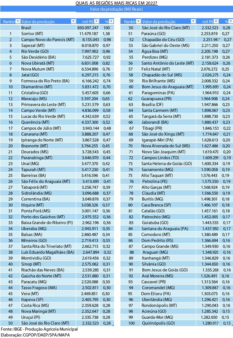 No topo da lista está Sorriso, que chegou a R$ 11 bilhões 479 milhões de faturamento no agro em 2022. Primavera do Leste aparece na posição 13 com R4 5,2 bilhões.