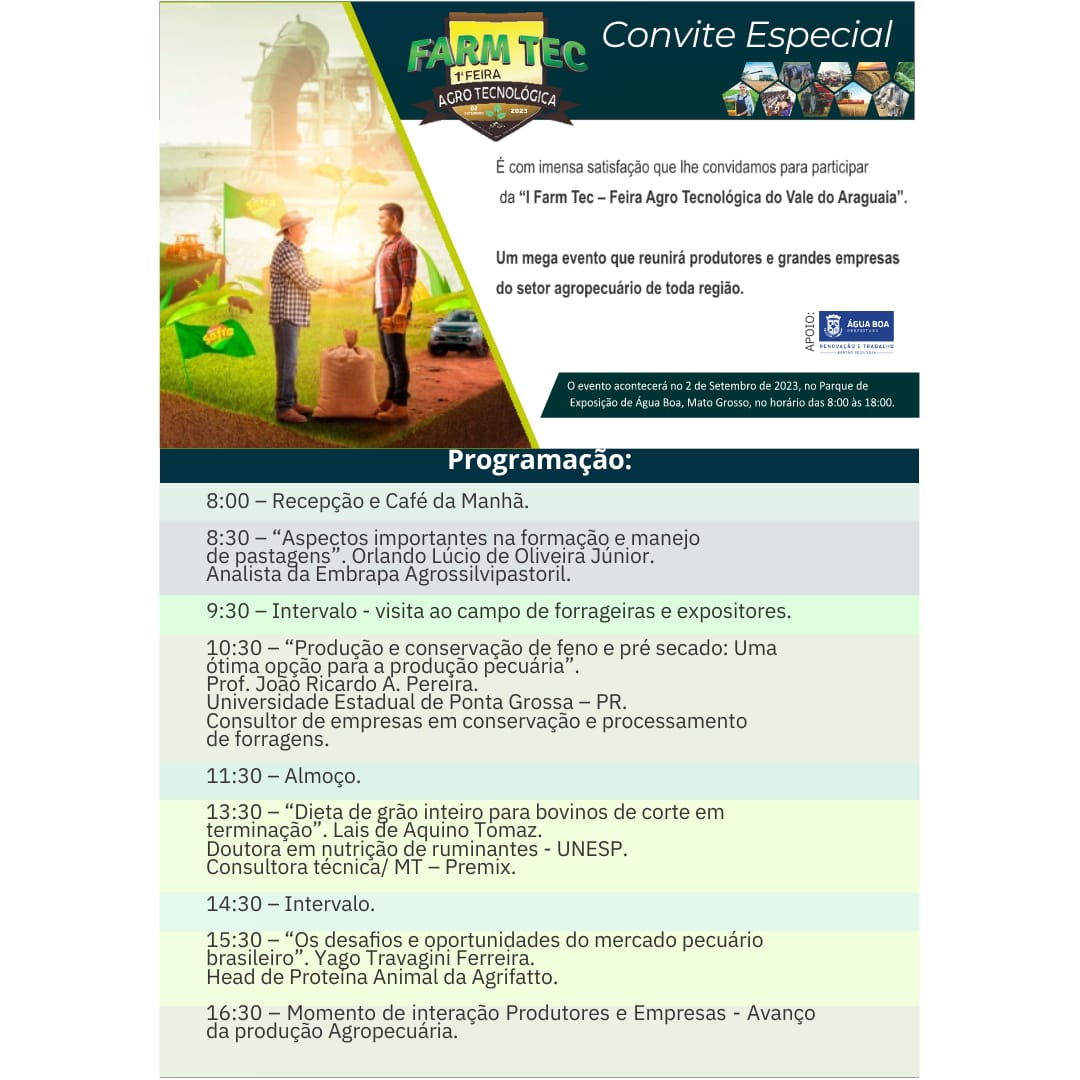 ============ ÁGUA BOA – Vem aí Farm Tec - Feira Agro Tecnológica do Vale do Araguaia. O evento será no sábado, 02/09, no Parque de Exposições Antonio Tura de Água Boa.