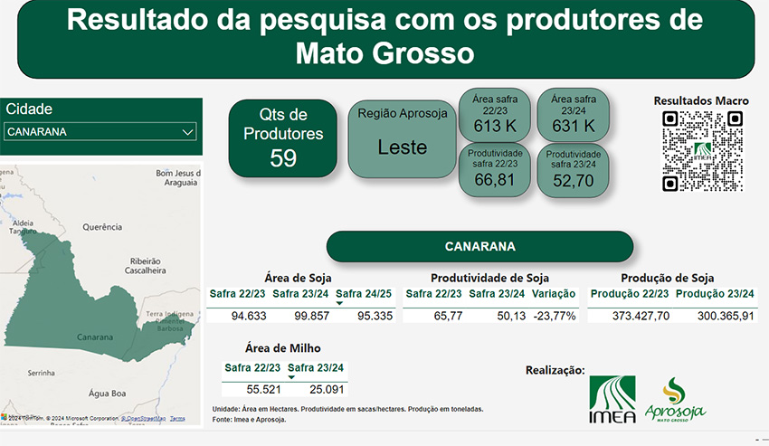 Segundo o IMEA, na safra passada, a produtividade média foi de 65 sacas de soja por hectare entre os 59 produtores pesquisados no município.