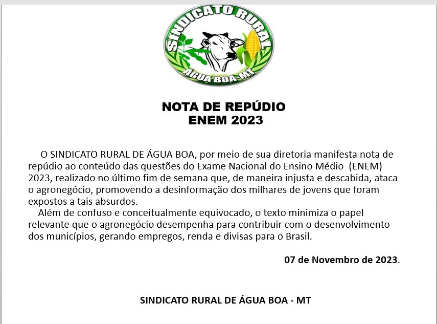 ÁGUA BOA - O Sindicato Rural de Água Boa emitiu nota de repúdio ENEM 2023.