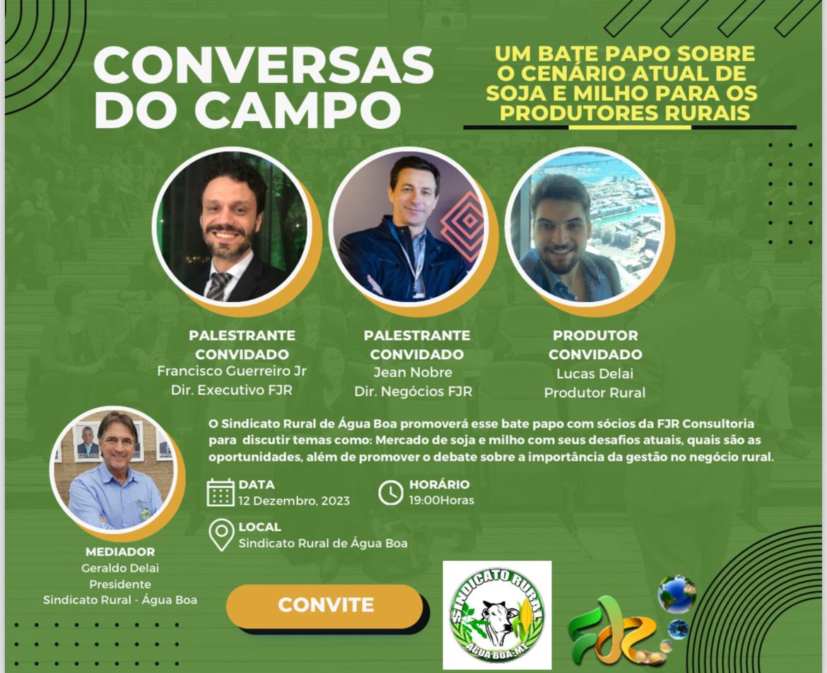 Os interessados devem confirmar presença pelo WhatsApp (66) 99644-7747. Participarão do evento, Francisco Guerreiro Júnior, Jean Nobre da FJR Consultoria, e o produtor rural Lucas Delai.
