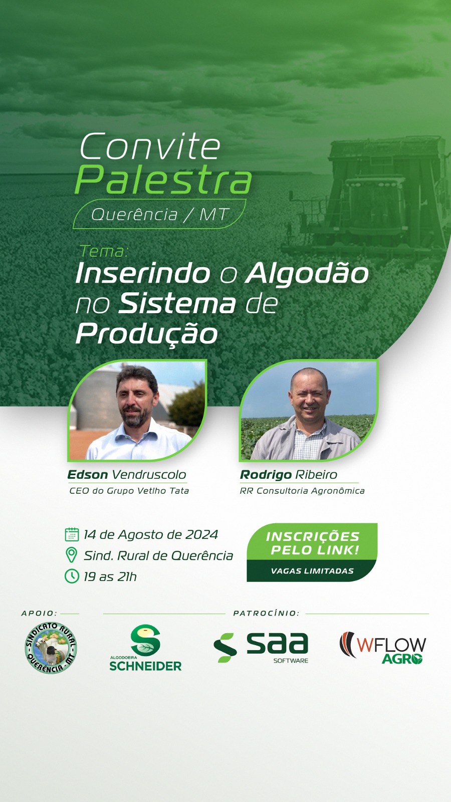 QUERÊNCIA - O Sindicato Rural de Querência sediará no próximo dia 14 de agosto de 2024 a palestra intitulada "Inserindo o Algodão no Sistema de Produção". O evento ocorrerá das 19h às 21h e contará com a participação de Edson Vendruscolo, CEO do Grupo Velho Tata, e Rodrigo Ribeiro, proprietário da RR Consultoria Agronômica.