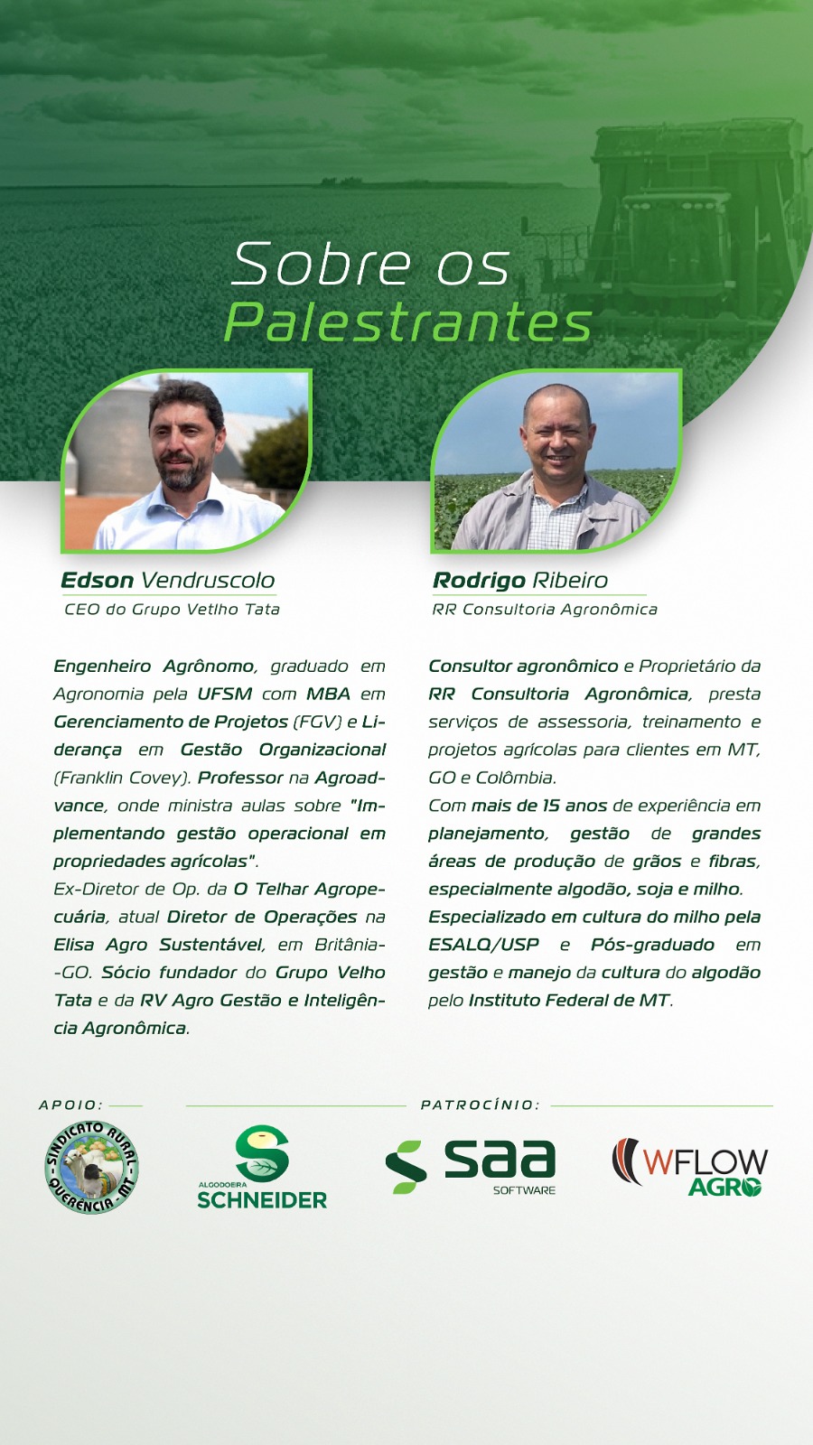 A palestra é organizada pelo Sindicato Rural de Querência e SAA Software e WFlow Agro, com o apoio da Algodoeira Schneider e WFlow Agro. O objetivo é oferecer aos participantes uma visão detalhada sobre a gestão e a integração do cultivo de algodão nos sistemas de produção agrícola.