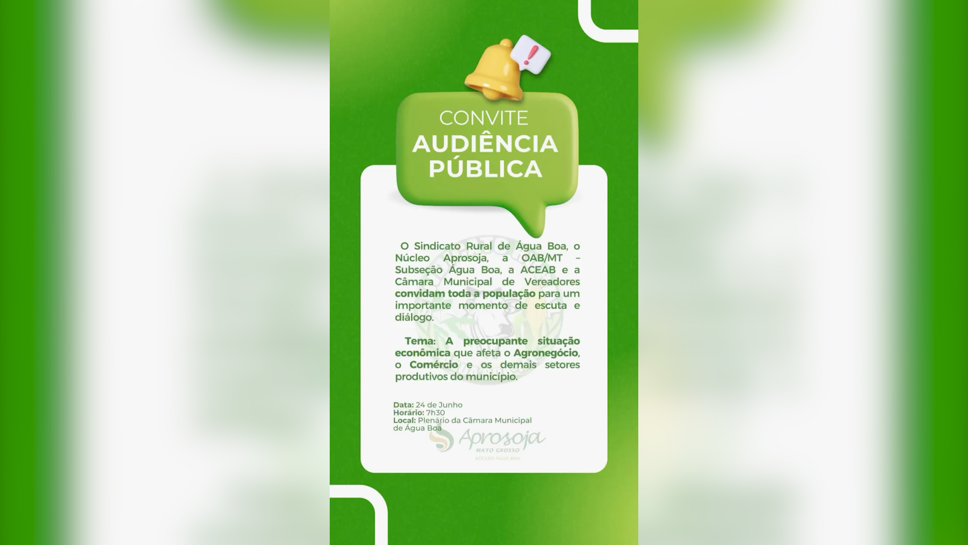 Atualizada 20 Junho 25ÁGUA BOA – Uma Audiência Pública está sendo convocada para a terça-feira, dia 24 de junho, às 7h 30min na Câmara de Vereadores.