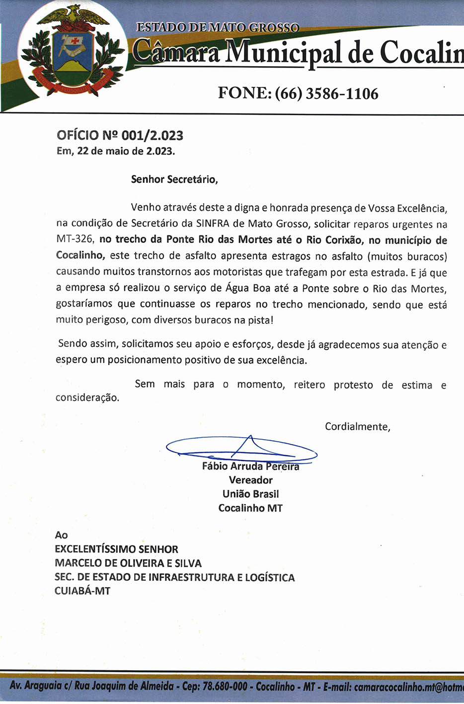 Recentemente, o vereador Fabio Arruda de Cocalinho encaminhou ofício à Sinfra – Secretaria Estadual da Infraestrutura, reivindicando a recuperação do trecho entre a ponte do Rio das Mortes e o rio Corixão, em Cocalinho.