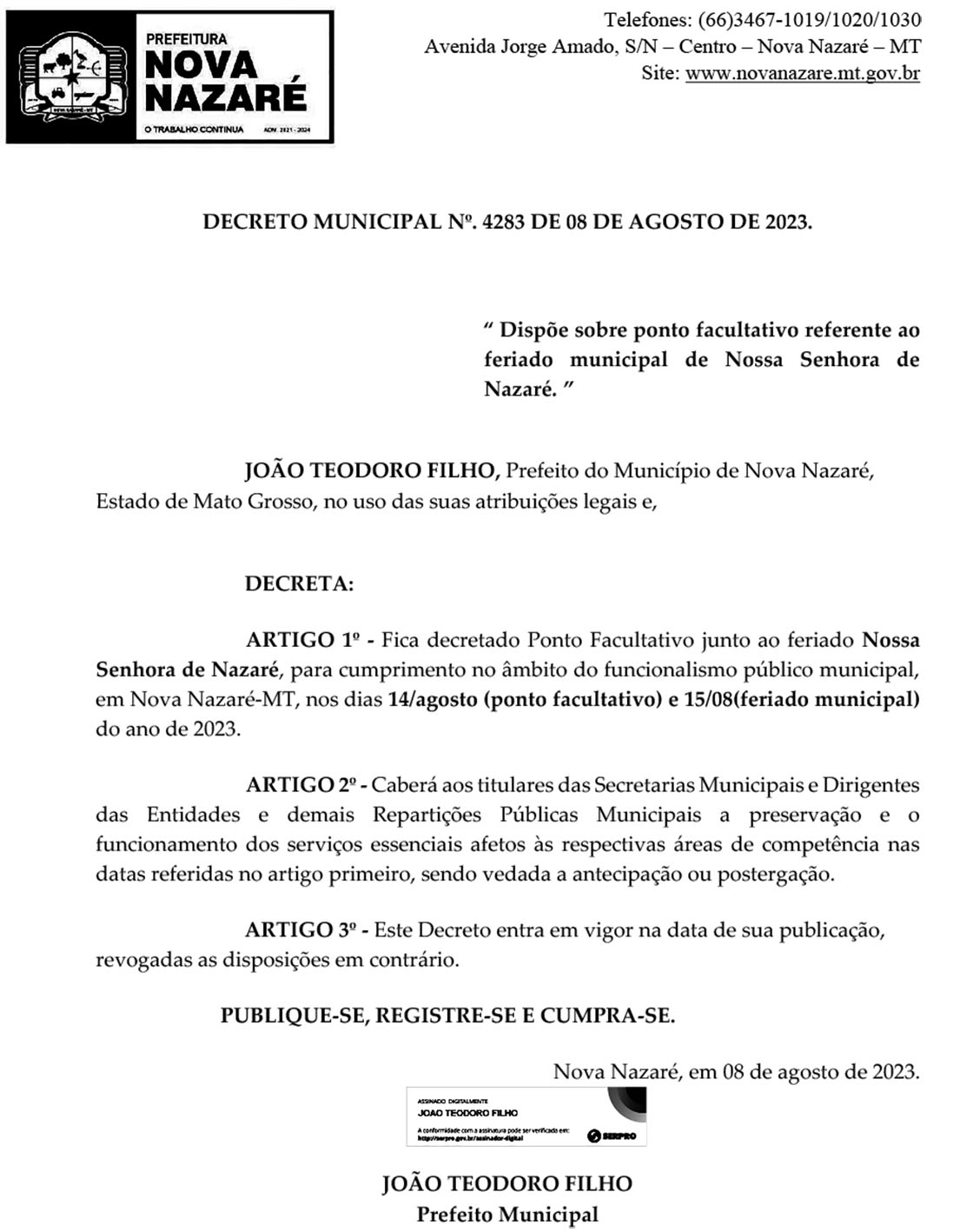 NOVA NAZARÉ - O prefeito baixou decreto estabelecendo Ponto Facultativo nas repartições públicas, tendo em vista ao Feriado de Nossa Senhora de Nazaré. Será ponto facultativo no dia 14 de agosto, e feriado municipal dia 15 de agosto em Nova Nazaré. Veja decreto em anexo.