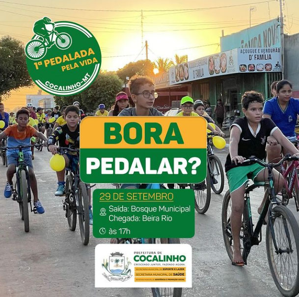 COCALINHO - A cidade promoverá a 1ª Pedalada Pela Vida.Será dia 29 de setembro com saída às 7h do Bosque Municipal e chegada no cais do porto.Informações na prefeitura.