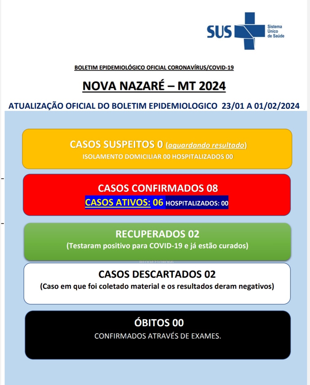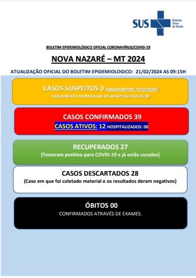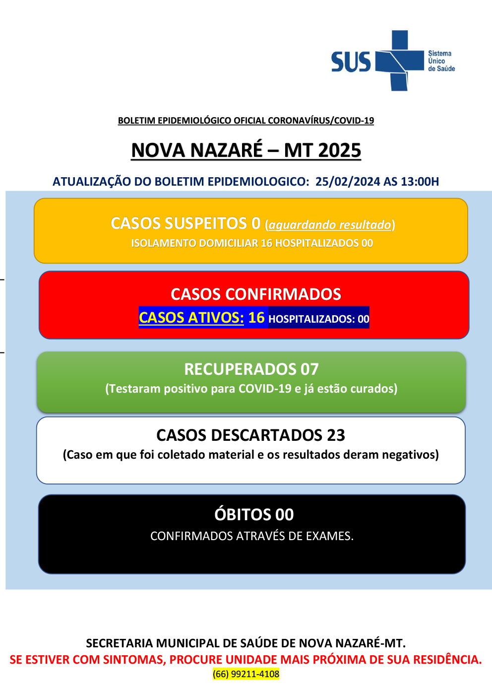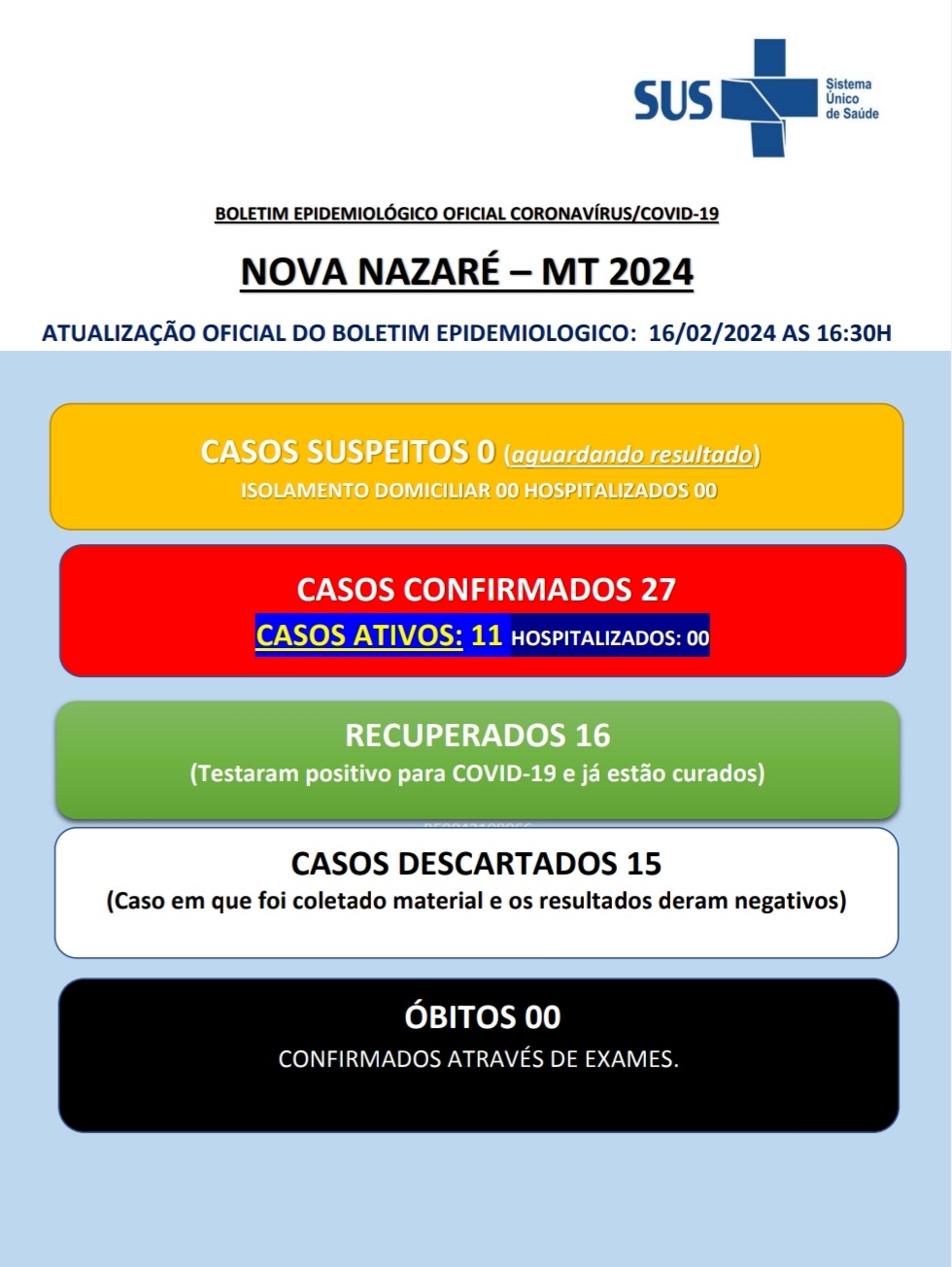 Atualizada dia 18 fev 24 NOVA NAZARÉ - A cidade continua a registrar pacientes diagnosticados com Covid-19.