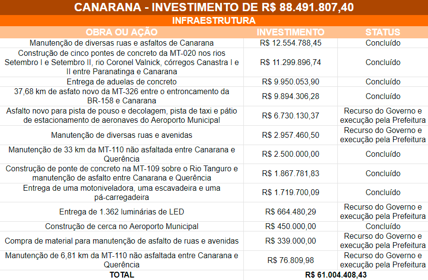 Para a infraestrutura foram destinados R$ 61 milhões. Os principais investimentos neste setor são de R$ 12,5 milhões para a manutenção de ruas e avenidas, além de R$ 13,1 milhões para a construção de cinco pontes sobre os rios Setembro I e Setembro II, o rio Coronel Valnick, os córregos Canastra I e II entre Paranatinga e Canarana, e uma na MT-109 sobre o Rio Tanguro, entre Canarana e Querência.