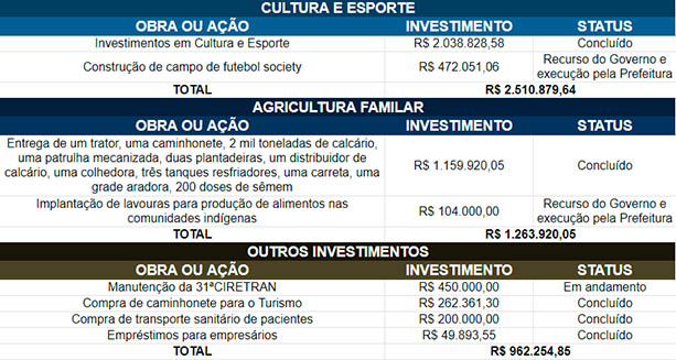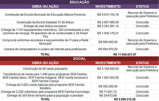 No Social, o principal investimento foi de R$ 3,1 milhões, em parceria com a Prefeitura Municipal, para a construção de 50 casas populares. Houve ainda a destinação de R$ 2,5 milhões para a distribuição de 5.825 cestas básicas, 2.226 cobertores e transferência de renda para 1.496 famílias pelos Programas SER Família, idealizados pela primeira-dama de Mato Grosso, Virginia Mendes.