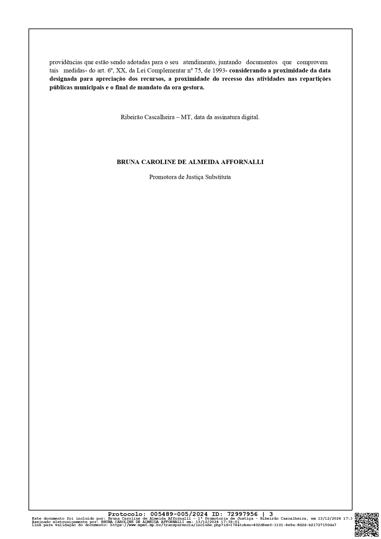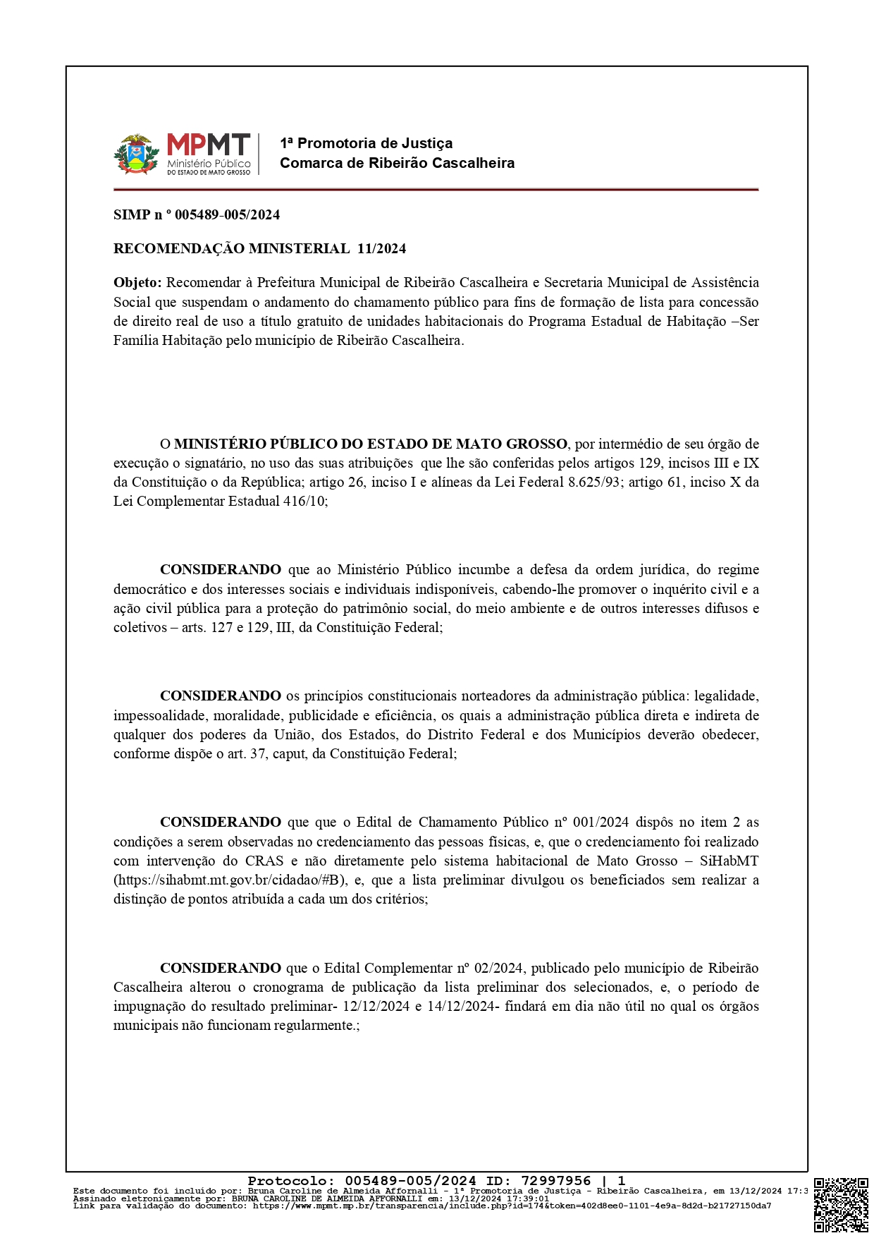 “O pedido do Ministério Público foi para alinhar as expectativas com a população de Ribeirão Cascalheira, porque estamos a menos de duas semanas do final do ano. Caso as famílias sejam escolhidas agora, talvez não seja possível fazer a entrega imediata, mas a nossa intenção é assegurar que as casas sejam destinadas a quem realmente precisa”, concluiu a promotora.