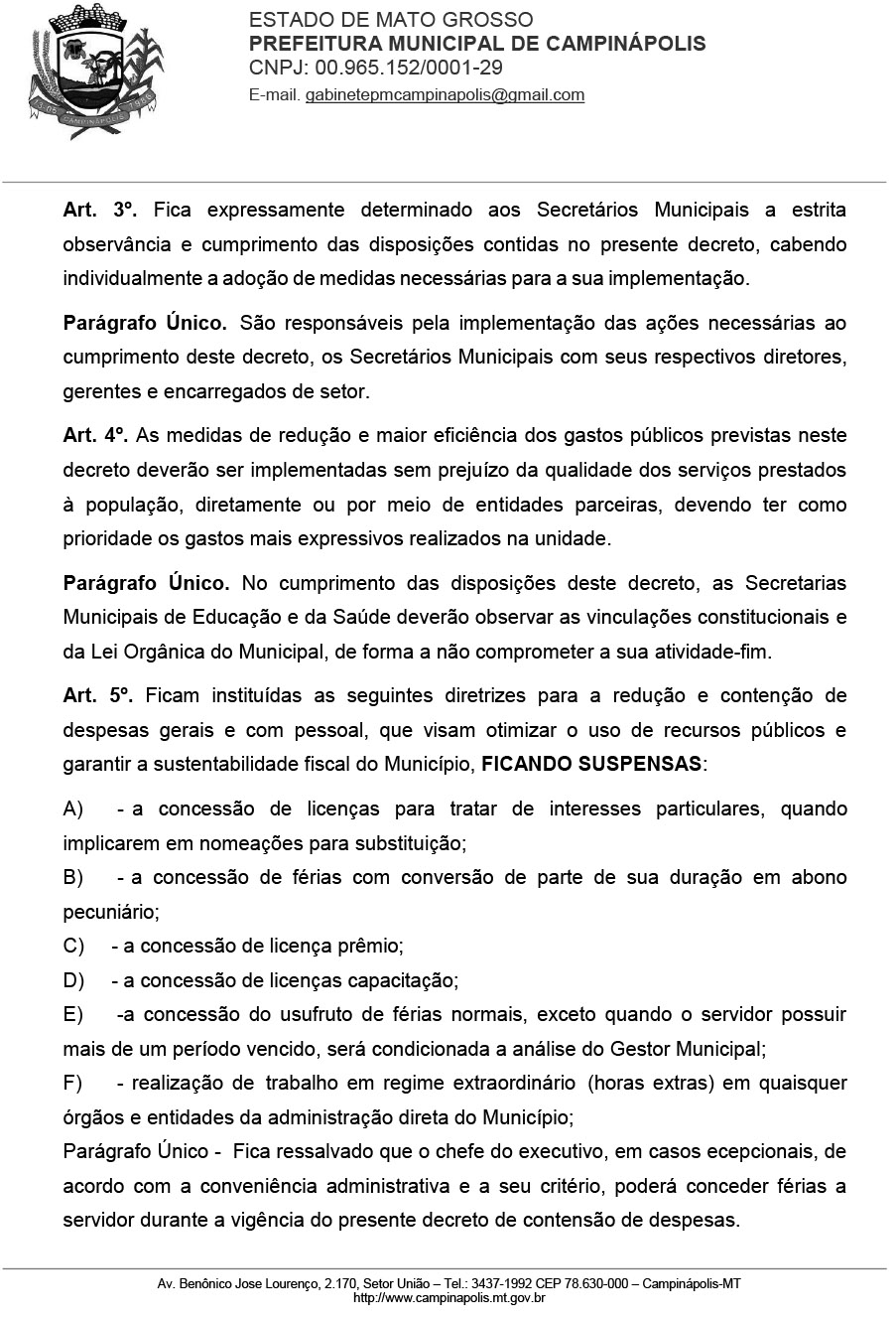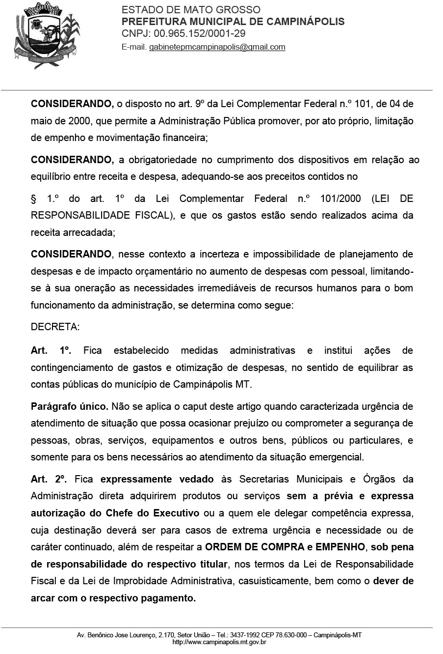 CAMPINÁPOLIS – Após assumir a administração municipal em primeiro de janeiro, o prefeito Jeovan Farias baixou decreto hoje, 13/01, estabelecendo medidas administrativas de contingenciamento de gastos.