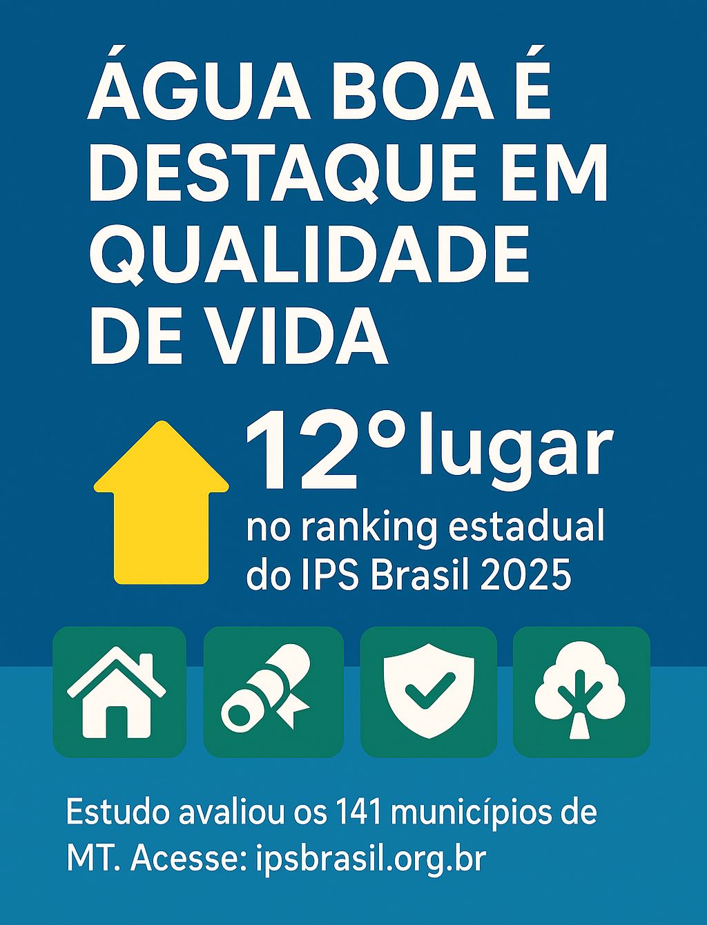 O município de Água Boa, localizado na região do Vale do Araguaia, a 730 km de Cuiabá, conquistou a 12ª posição no ranking estadual de qualidade de vida de Mato Grosso, de acordo com os resultados do Índice de Progresso Social (IPS) Brasil 2025 divulgados recentemente. O estudo, que busca medir o desenvolvimento social e ambiental para além dos indicadores puramente econômicos, analisou a performance dos 141 municípios mato-grossenses.