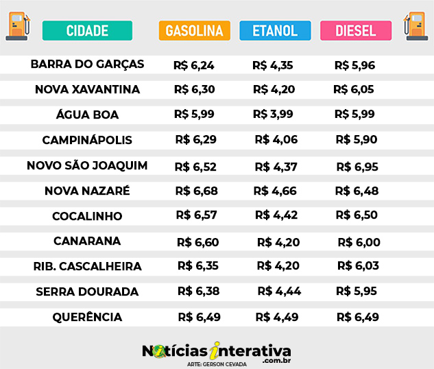 Na região, a gasolina mais barata está em Água Boa e Serra Dourada: R$ 6,29. A mais cara em Cocalinho: R$ 6,86.