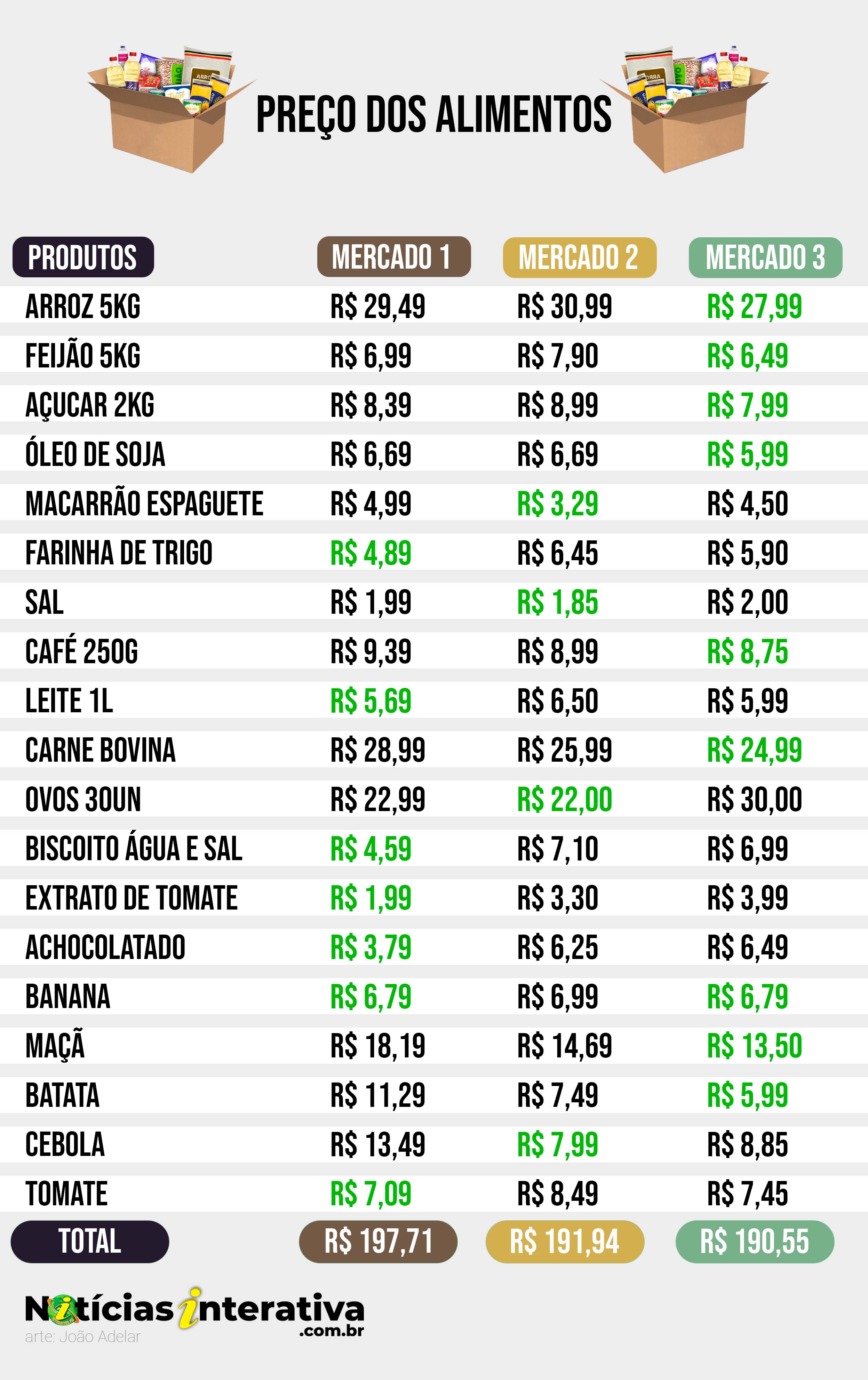 Porém, quem pesquisar nos 3 mercados e comprar apenas os produtos mais baratos, paga pela mesma cesta básica, apenas R$ 169,40.
