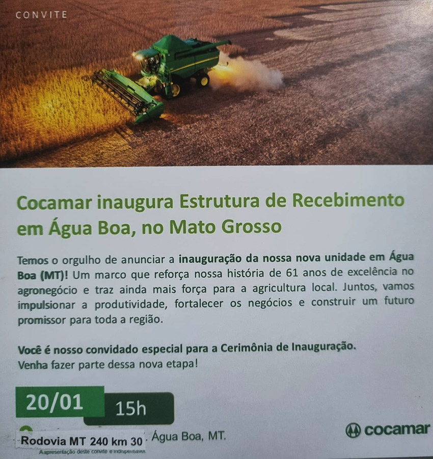 Atualizazda dia 19 jan 25 ÁGUA BOA - Será inaugurada hoje, segunda-feira, 20 de janeiro de 2025, a unidade Cocamar de Água Boa.