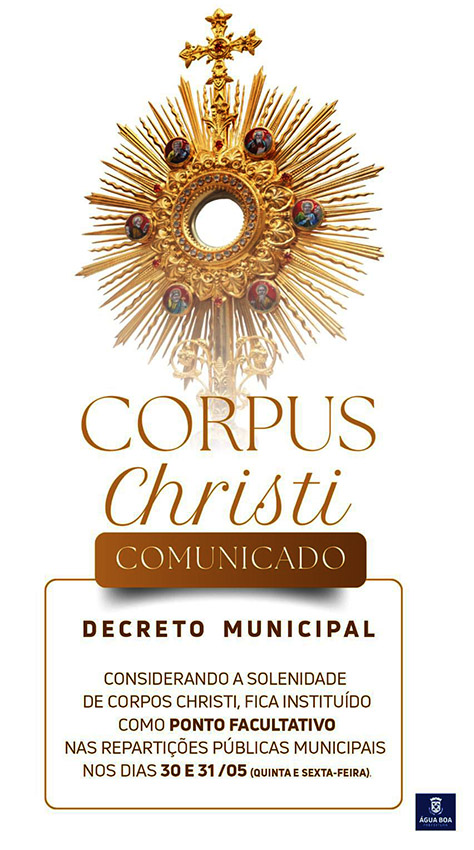 ÁGUA BOA – As repartições públicas municipais fecham para o feriadão de Corpus Christi.