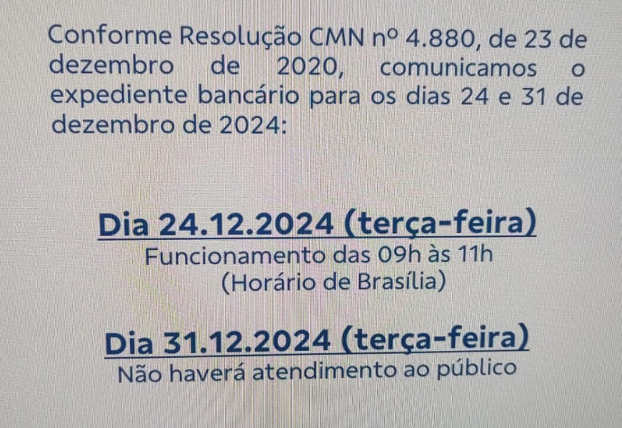 No dia 24 de dezembro, véspera do Natal, os bancos estarão abertos somente das 9h às 11h (hora de Brasília). Dia 25, feriado de Natal.