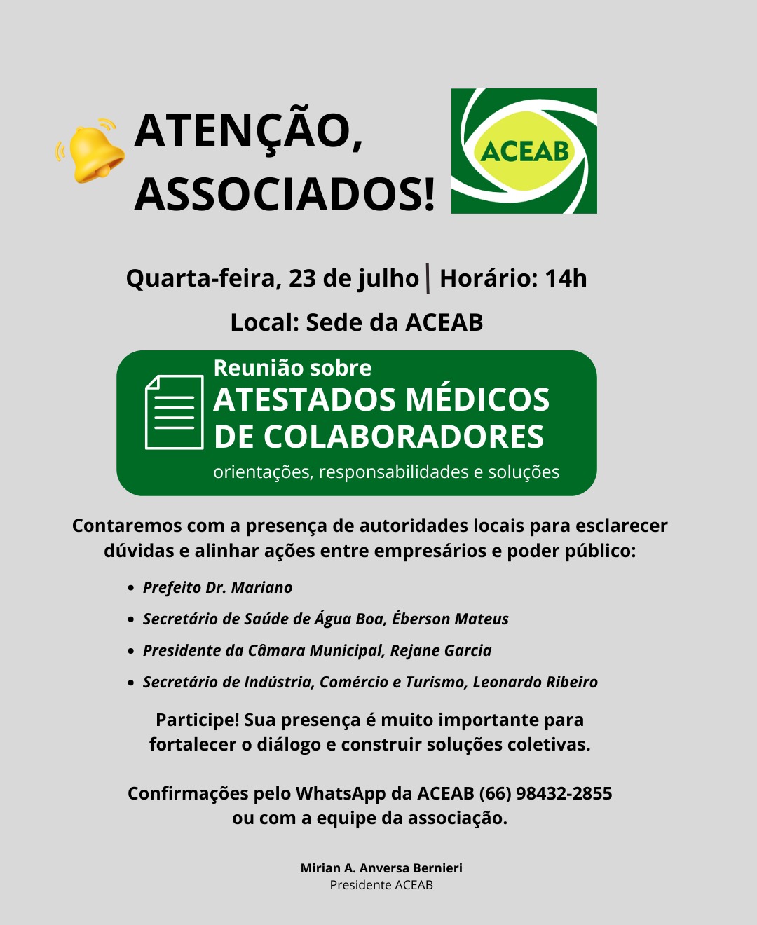 ACEAB debaterá com empresários os atestados médicos de colaboradoresÁGUA BOA - A Associação Comercial e Empresarial vai reunir os empresários para discutir um assunto importante: atestado médico de colaboradores.