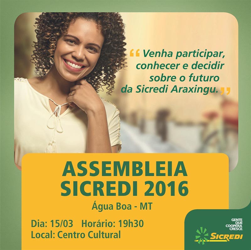 ÁGUA BOA - Primando sempre pelo principio da gestão democrática e total transparência, chegou o momento dos associados da Sicredi Araxingu exercerem seu papel de donos do negócio e participarem de forma ativa na gestão da cooperativa. No dia 15 de março, Água Boa será o 11º município a receber as Assembleias de Núcleos 2016, momento em que as decisões coletivas irão nortear o futuro da cooperativa. Para isso, a participação dos cooperados é fundamental.