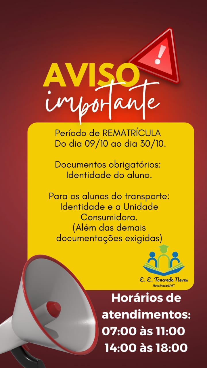 NOVA NAZARÉ - A Escola Estadual Tancredo Neves alerta para o período de rematrícula.