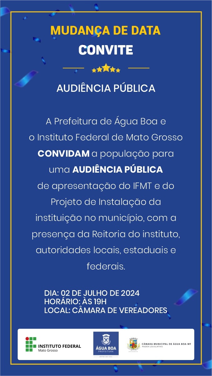 ÁGUA BOA - Uma audiência pública vai apresentar o projeto de instalação do IFMT - Instituto Federal de Mato Grosso na cidade.