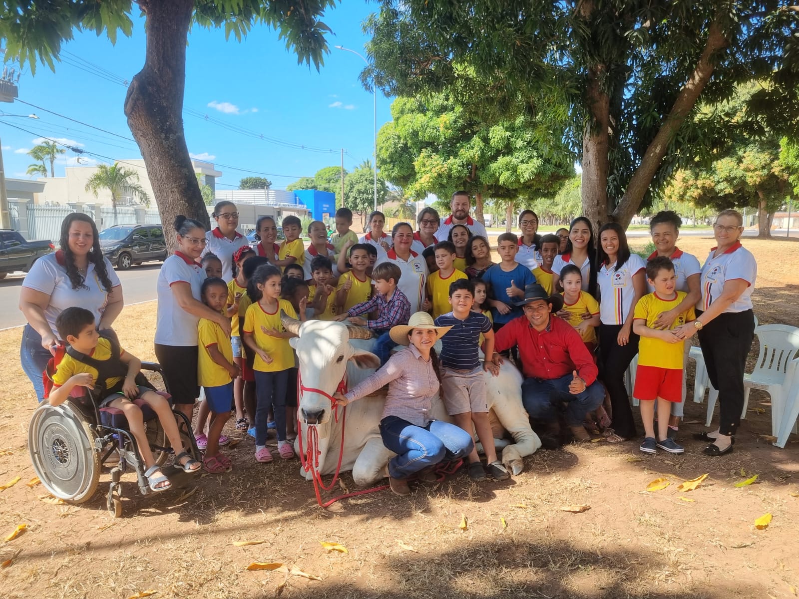 Em semana de Expovale alguns alunos podem ter mais dificuldade para acessar o rodeio. Por isso, a ideia foi levar um boi Nelore manso para interagir com as crianças da Associação Pestalozzi.