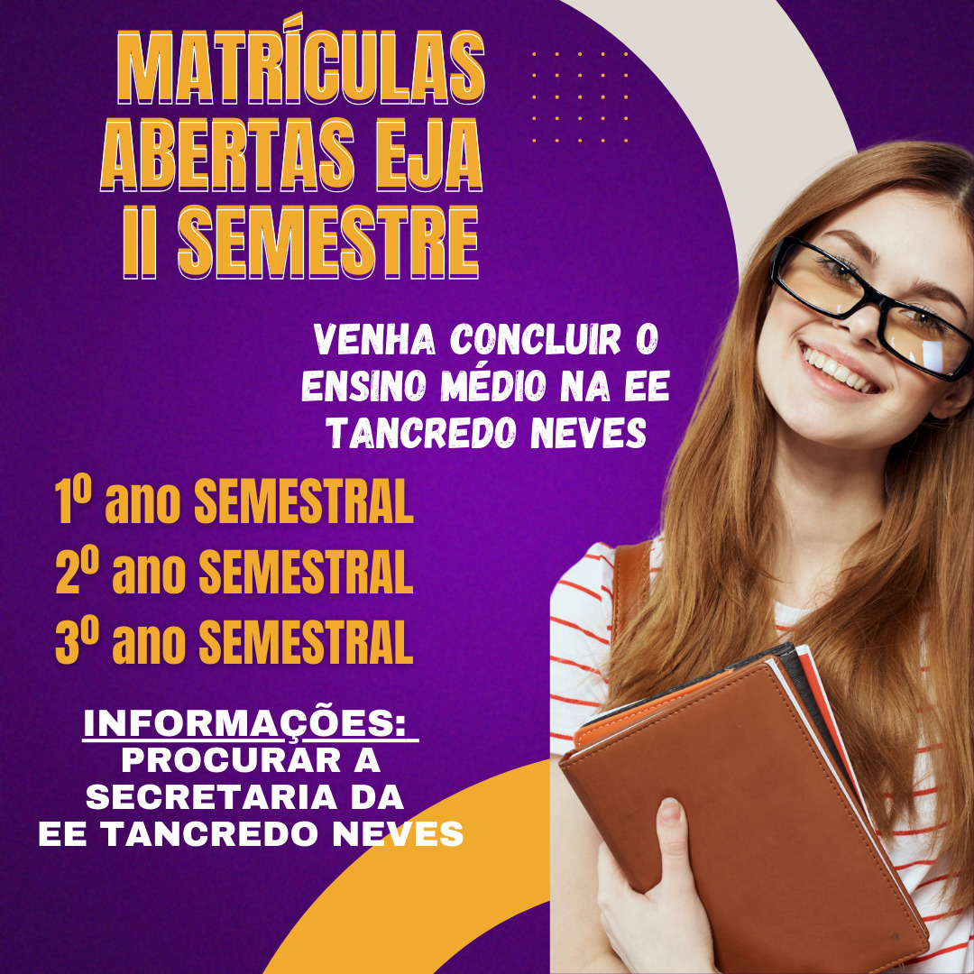 NOVA NAZARÉ - Estão abertas as matrículas da Educação de Jovens e Adultos EJA, para o segundo semestre do ano na Esc. Estadual Tancredo Neves.