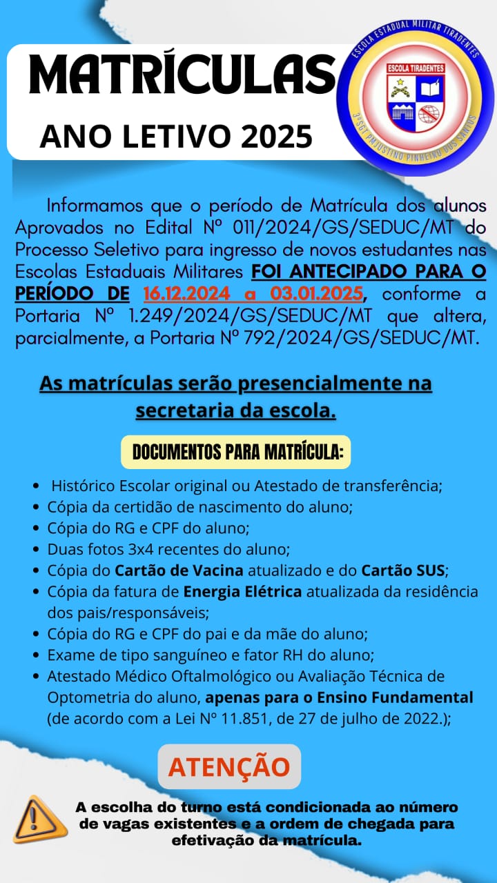 ÁGUA BOA - A direção da Escola Militar Tiradentes 3º Sgt Justino alerta para antecipação do período de matrícula de alunos aprovados no Processo Seletivo.