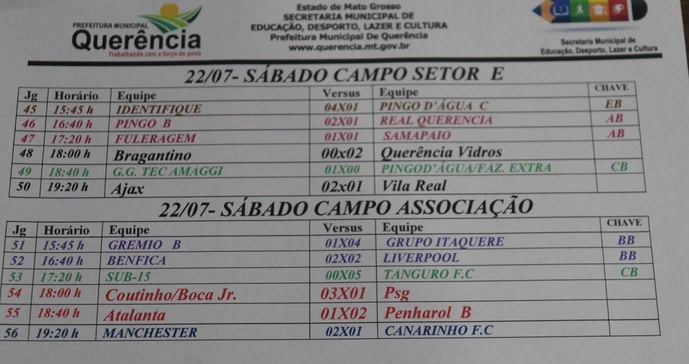 QUERÊNCIA – Acontece nesta segunda (24), a primeira rodada de disputa pelo Campeonato de Futebol Society na categoria veteranos no setor E. Entrarão em campo as equipes: