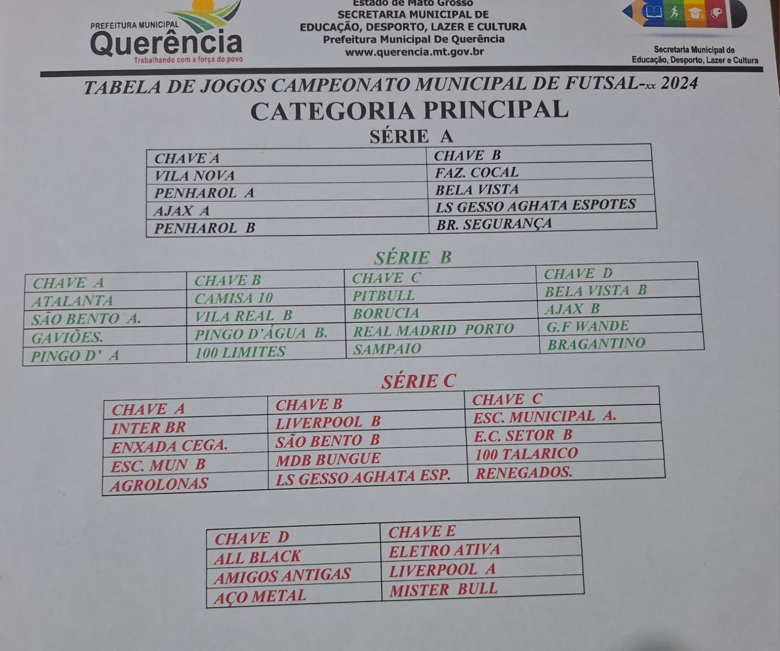 QUERÊNCIA - O aguardado Campeonato Municipal de Futsal de Querência começa na próxima quarta-feira, 16 de outubro de 2024, com todas as partidas iniciando a partir das 19 horas nas quadras dos ginásios Nilo Perin e Carlos Bezerra. O torneio, que conta com um total de 50 equipes masculinas, está dividido nas categorias A, B e C. Na categoria A, 7 equipes competem entre si, enquanto a categoria B conta com 20 equipes, e a categoria C, com 25 equipes.