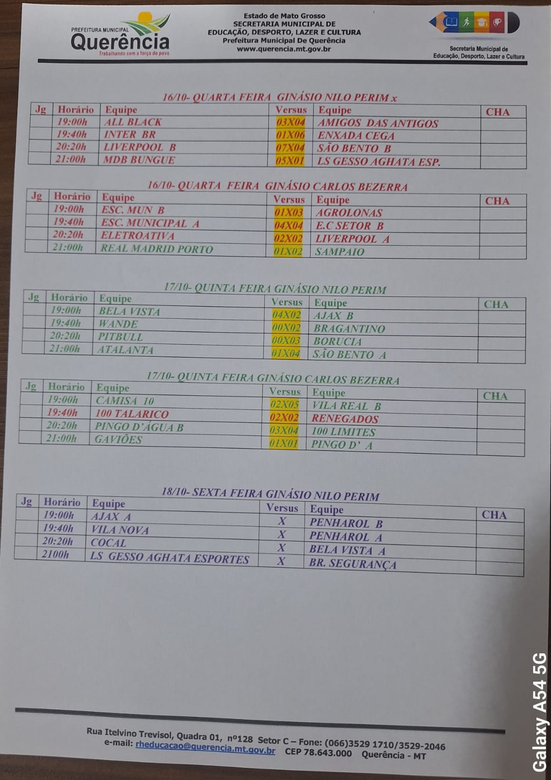 QUERÊNCIA - Nesta segunda-feira, 21 de outubro, mais uma rodada movimentou o Campeonato Municipal de Futsal de Querência. Com partidas realizadas em dois ginásios a partir das 19h, a competição segue em ritmo intenso. Confira os jogos de hoje: