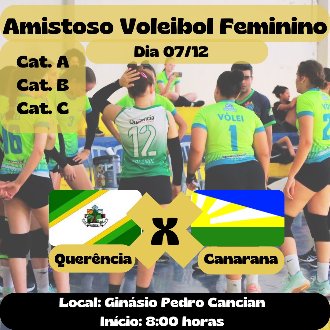 QUERÊNCIA - As equipes de voleibol feminino de Querência têm compromisso marcado para este sábado, dia 7 de dezembro, em amistosos contra as equipes de Canarana. Os jogos, válidos pelas categorias A, B e C, serão realizados no Ginásio Pedro Cancian, com início previsto para as 8h da manhã.