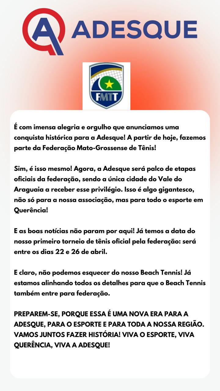 Para mais informações, entre em contato com a Federação Mato-grossense de Tênis (FMTT) ou acesse os canais oficiais.