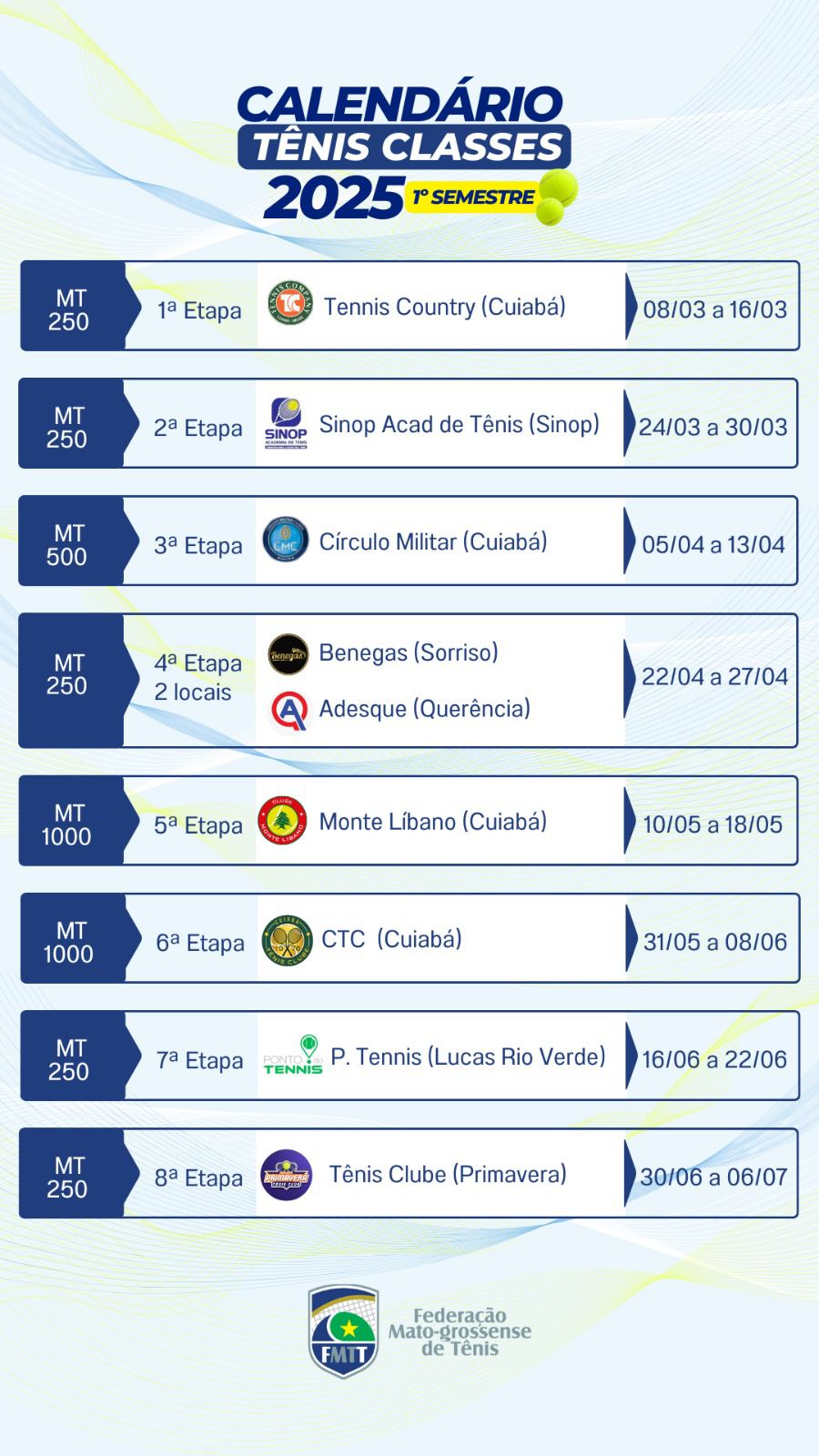 MATO GROSSO - A Federação Mato-grossense de Tênis (FMTT) anunciou o calendário oficial para o Torneio Tênis Classes 2025 – Primeiro Semestre, com oito etapas programadas entre março e julho, envolvendo diversas cidades do estado. Confira os detalhes de cada etapa: