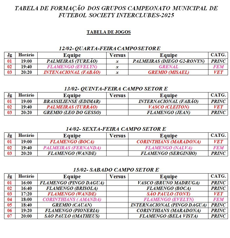 - Categoria Principal: Flamengo (Boca) X Palmeiras (Diego G2)