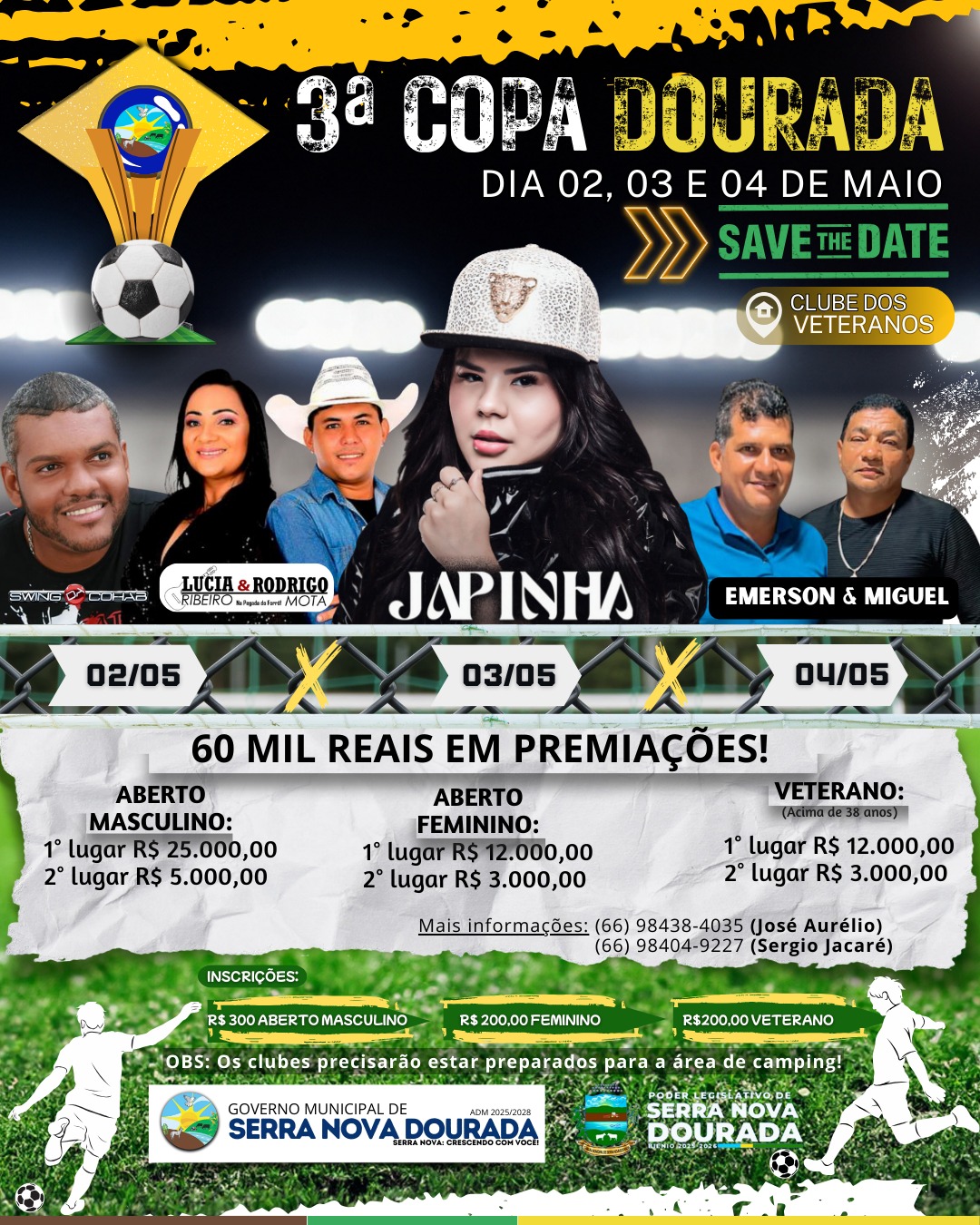 A 3ª edição da Copa Dourada movimentou Serra Nova Dourada nos dias 02, 03 e 04 de maio, reunindo esporte, música e integração regional. O evento aconteceu no Clube dos Veteranos, com apoio da Rota Esportiva e do Governo Municipal de Serra Nova Dourada.