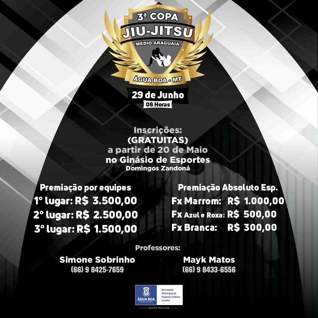 Preparem-se, amantes do jiu-jitsu! A cidade de Água Boa sediará a 3ª Copa de Jiu-Jitsu do Médio Araguaia no dia 29 de junho, a partir das 8h da manhã.