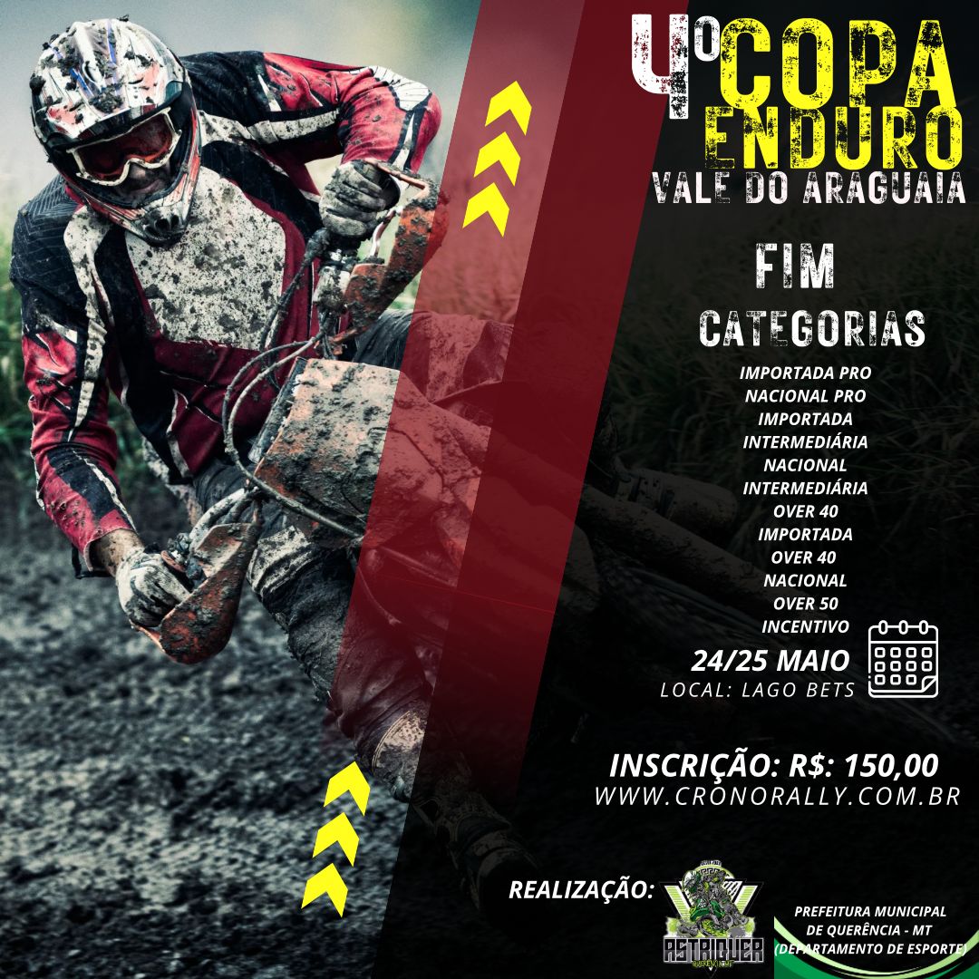 QUERÊNCIA - A cidade de Querência (MT) será palco da adrenalina e velocidade neste fim de semana com a realização da 4ª Copa Enduro Vale do Araguaia, nos dias 24 e 25 de maio, no tradicional Lago Azul (Bets). O evento reúne amantes do motociclismo off-road de toda a região e já conta com 65 pilotos inscritos.