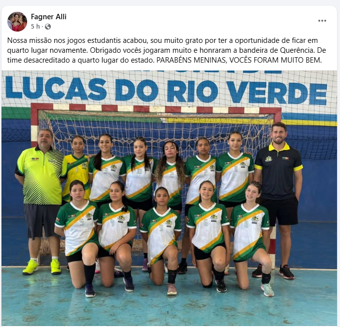 "Nossa missão nos jogos estudantis acabou, sou muito grato por ter a oportunidade de ficar em quarto lugar novamente. Obrigado, vocês jogaram muito e honraram a bandeira de Querência. De time desacreditado a quarto lugar do estado. PARABÉNS MENINAS, VOCÊS FORAM MUITO BEM."