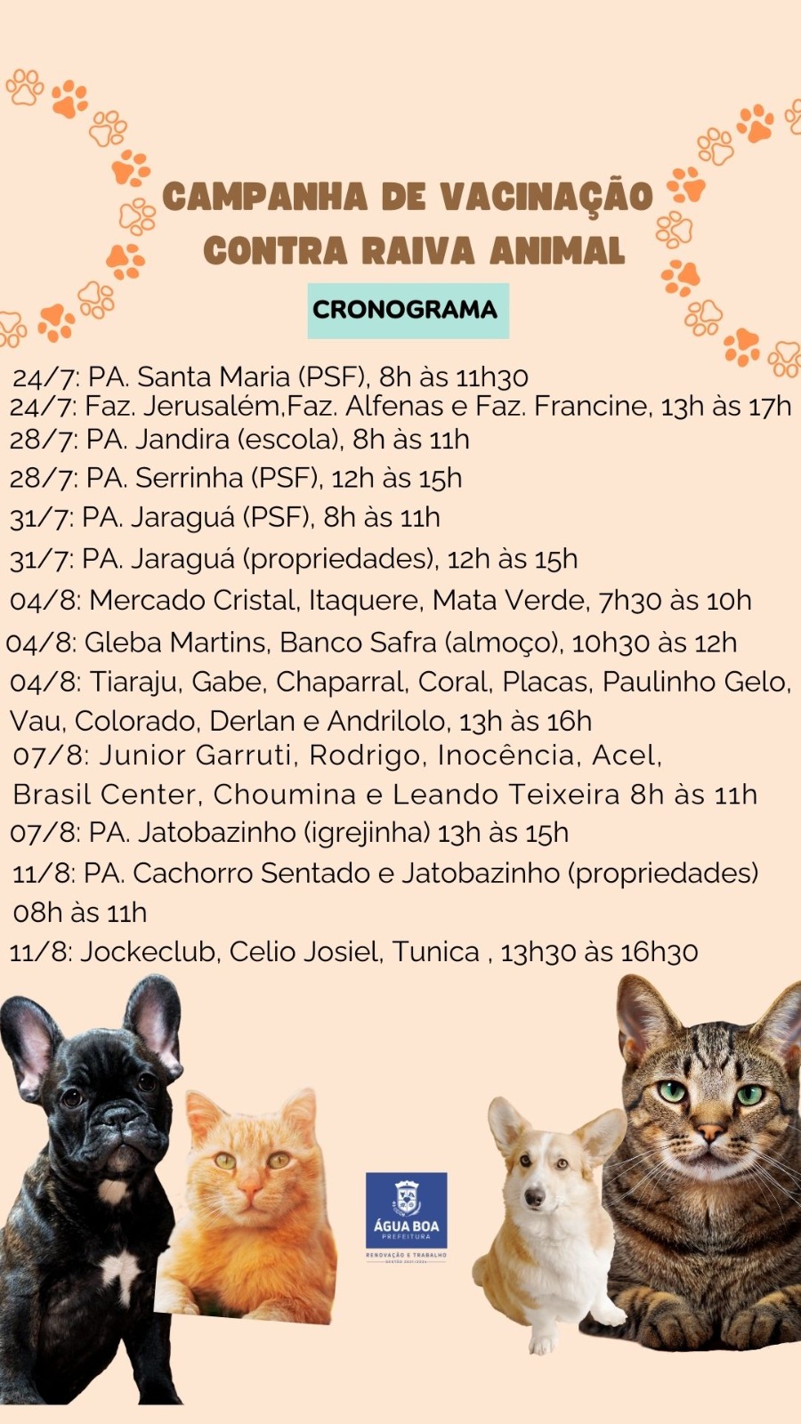 ÁGUA BOA – A Secretaria de Saúde promove a campanha de vacinação contra a raiva animal. A vacinação de cães e gatos é necessária.